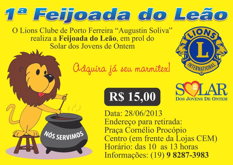 No sábado, 28 de junho, ocorrerá a entrega de marmitex da 1ª Feijoada do Leão, na Praça Cornélio Procópio (Matriz), defronte às Lojas CEM. Esta campanha é realizada pelo Lions Clube de Porto Ferreira “Augustin Soliva”, com o objetivo de auxiliar o Solar dos Jovens de Ontem.