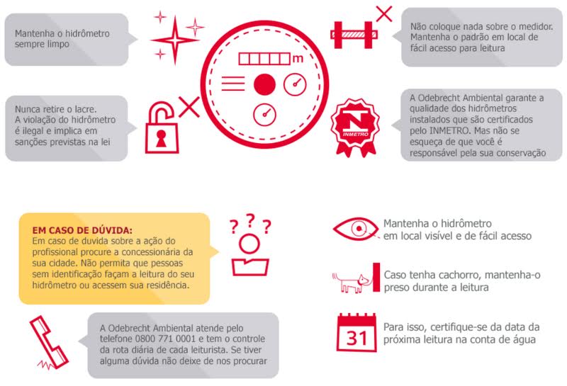 Todo imóvel abastecido com água potável pela rede pública possui um hidrômetro, que é responsável por registrar o consumo realizado no local. A partir dos dados marcados pelo aparelho, um agente comercial emite a fatura do serviço prestado. Aos moradores cabe assegurar o acesso ao equipamento instalado em suas residências.