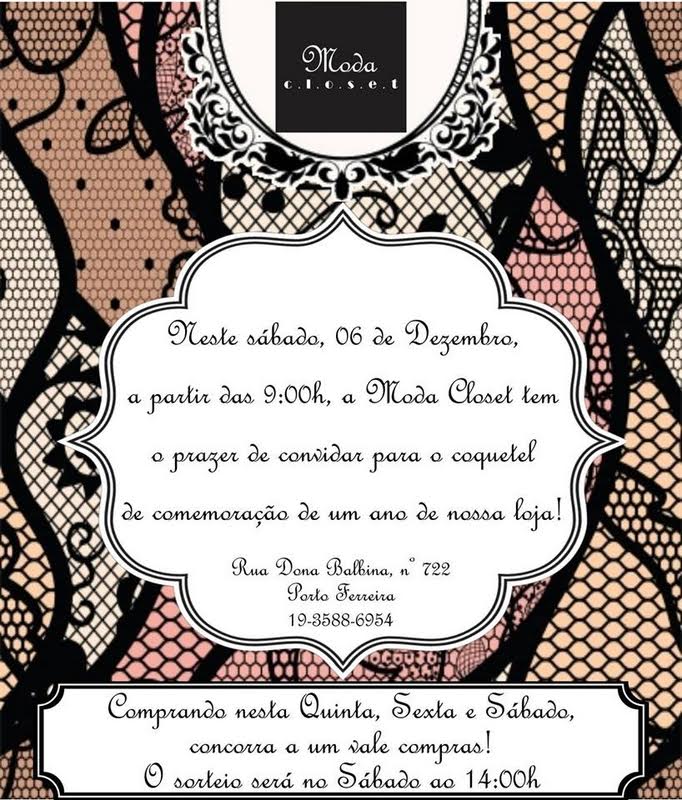 A direção da Moda Closet convida amigos e clientes para o primeiro aniversário da loja, a ser realizado amanhã, 06 de dezembro de 2014. Todos que comprarem hoje e amanhã na loja estarão participando de um sorteio de vale compras a ser realizado às 14:00 hs.