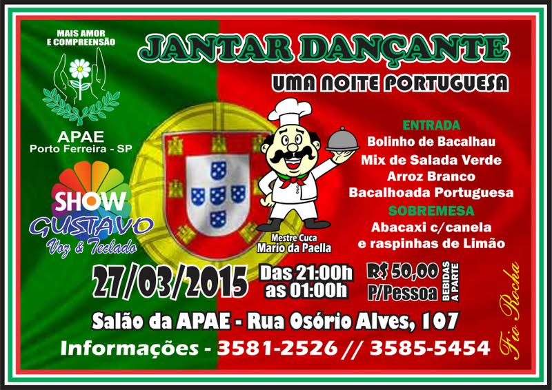 A APAE – Associação de Pais e Amigos dos Excepcionais de Porto Ferreira promoverá no dia 27 de março o tradicional Jantar Dançante com o tema “Uma Noite Portuguesa”, com início às 21 horas.