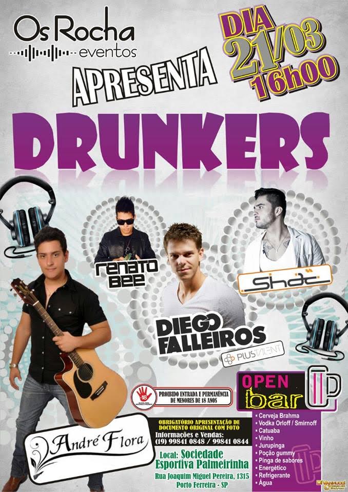 Os Rocha Eventos apresenta Drunkers dia 21 de Março de 2015, próximo sábado, na Sociedade Esportiva Palmeirinha, em Porto Ferreira-SP.