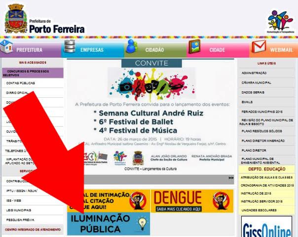 Basta acessar o endereço do site oficial – www.portoferreira.sp.gov.br – e abaixo da foto principal que fica no meio da página há um pequeno retângulo azul claro, onde está escrito em preto “ILUMINAÇÃO PÚBLICA”.