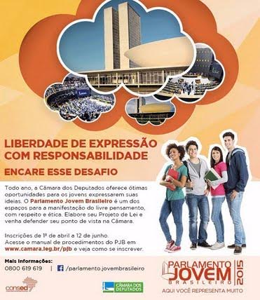 As inscrições começaram no dia 1º de Abril e vão até 12 de junho, estudantes de todo o país poderão se inscrever para concorrer a uma das 78 vagas da 12ª edição do Parlamento Jovem Brasileiro (PJB), na Câmara dos Deputados, em Brasília.
