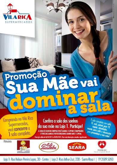 Vila Rica Supermercados está realizando a promoção “Sua mãe vai dominar a sala”, onde o o cliente concorre para o Dia das Mães a uma sala completa. A cada R$ 50,00 em compras o cliente ganha um cupom para concorrer e ainda a cada 5 itens de compras das marcas patrocinadoras ganha mais um cupom.