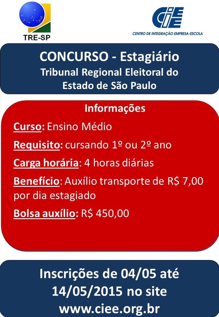 Confira o edital acessando o link: http://www.ciee.org.br/portal/estudantes/pe/pseletivo/documentos/edital_tre_sp_abr15.pdf