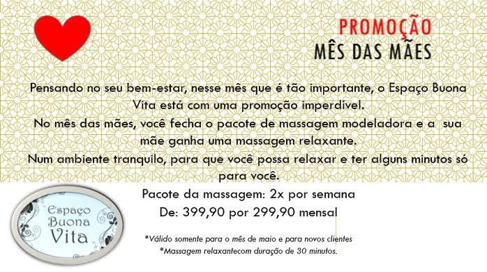 O Espaço Buona Vita pensando no seu bem-estar, nesse mês que é tão importante, tem uma promoção imperdível.