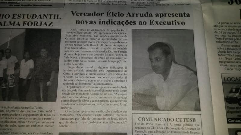 O vereador Élcio Arruda esteve na última semana na rua Elias José Araujo, no Jardim Porto Novo (próximo a torre de celular), a pedido de moradores, que reivindicam a instalação de braço de iluminação em um poste, além da limpeza de mato no local.
