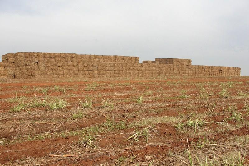 Quem trafega próximo às áreas de colheita, já pode observar enormes fardos de palha prensados e empilhados prontos para o transporte até à usina.