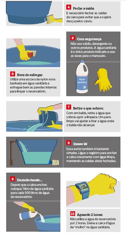 Antes de iniciar a limpeza é preciso esvaziar a caixa d’água, mantendo apenas um palmo de água dentro dela. Durante o processo, devem ser usadas somente água e água sanitária. Nunca use sabão, detergente ou outros produto! Eles podem ficar impregnados nas paredes do reservatório. Esfregue bem o fundo e as paredes da caixa d’água. Em seguida retire a água e o material que restou da limpeza e realize a desinfecção. Após esta etapa, é preciso esvaziar novamente o reservatório. Esta manutenção deve ser feita a cada 6 meses.