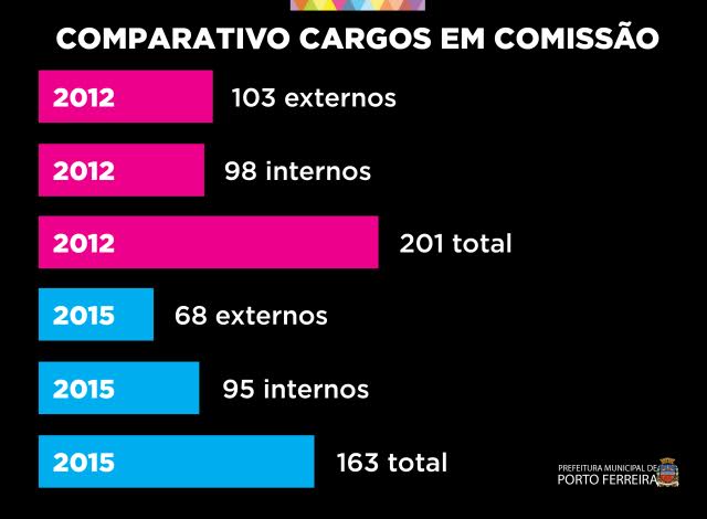 Um comparativo divulgado esta semana pela Divisão de Recursos Humanos da Prefeitura de Porto Ferreira mostra que na atual Administração Municipal o número de cargos em comissão externos caiu 34% em comparação ao governo anterior, ou cerca de um terço.