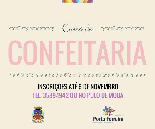 O Departamento de Promoção Social da Prefeitura de Porto Ferreira informa que estão abertas as inscrições para o curso gratuito de Confeitaria. As inscrições podem ser feitas até o dia 6 de novembro (sexta-feira da próxima semana), no Polo de Moda, localizado à rua Bento José de Carvalho, 55, Centro, ou pelo telefone 3589-1942, com Joana, das 8 às 14 horas.