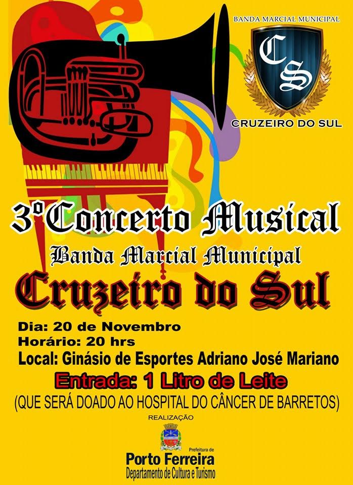 A Banda Marcial Municipal Cruzeiro do Sul de Porto Ferreira realizará no dia 20 novembro, a partir das 20 horas, no Ginásio de Esportes Adriano José Mariano, o seu 3º Concerto Musical.