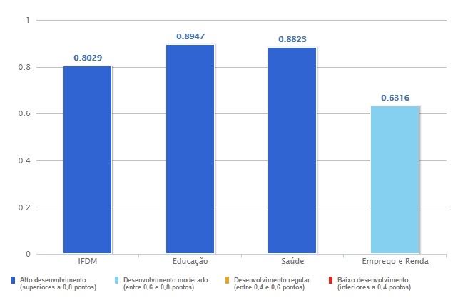 O que melhorou o posicionamento do município foi uma melhora dos índices de Educação e Emprego e Renda, que passaram de 0,8669 e 0.6102 para, respectivamente, 0,8947 e 0,6316, de 2012 para 2013. Por sua vez, o Índice Saúde recuou de 0,9026 para 0,8823.