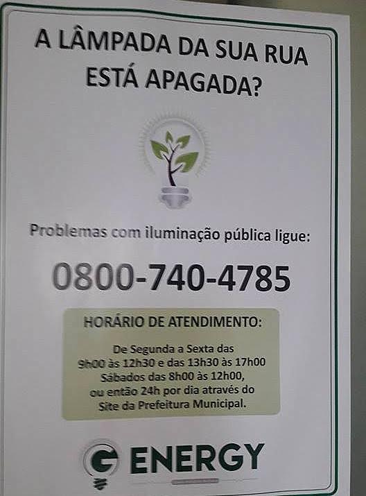 O telefone para as pessoas fazerem os pedidos à empresa ENERGY é o 0800-740-4785, no horário comercial, ou através do site da prefeitura, 24 horas por dia.