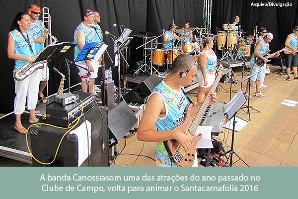 Formada em 2002, por músicos locais, a banda Canossiasom se consagrou animando festas e bailes em Santa Rita e região. Em 2015, o grupo foi uma das atrações do Carnaval no Clube de Campo, integrando mais músicos e dançarinas, especialmente para o evento. O sucesso foi tão grande, que este ano a banda santa-ritense volta com atração principal.