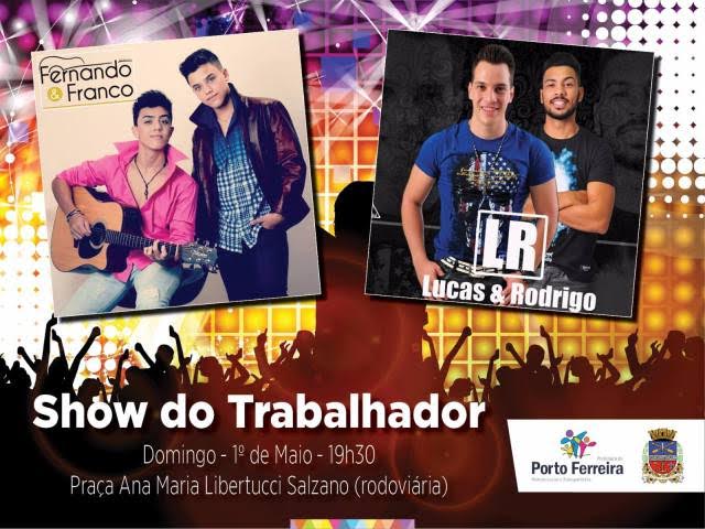 No próximo domingo, 1º de maio, quando se comemora o “Dia Internacional do Trabalhador”, haverá um show musical programado pela municipalidade com a participação das duplas Fernando & Franco e Lucas & Rodrigo. O evento será praça Ana Maria Libercucci Salzano (da Rodoviária), com início previsto para as 19h30.