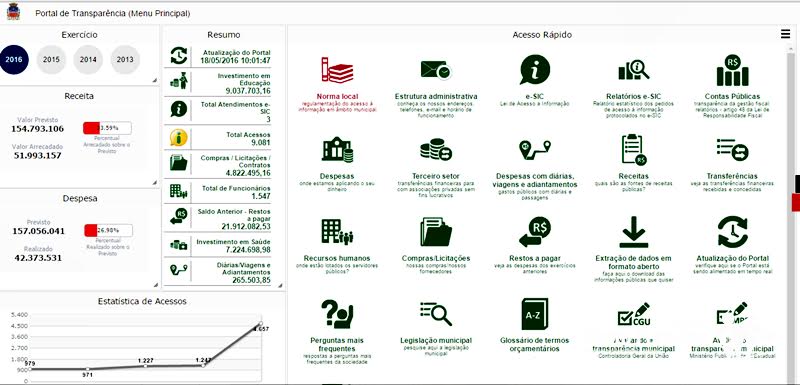 Para acessar o Portal da Transparência, basta clicar na página inicial do site oficial no campo “Acesso à Informação – Transparência Pública”, localizado na coluna da esquerda entre os campos de “Concursos” e “Licitações”. Ao abrir nova página, clicar no ícone verde do lado esquerdo “Lei de Acesso à Informação”, que a página do Portal da Transparência surge com diversos campos para informações e pesquisas.