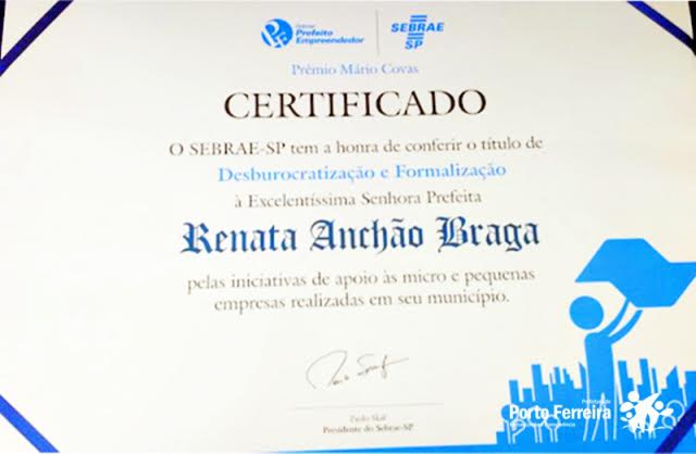 Confirmando as prévias informações colhidas junto ao Escritório de Governo Sebrae – Regional São Carlos, a Administração Municipal ferreirense recebeu cópia do certificado que concede à prefeita Renata Braga o Selo Prefeito Empreendedor Sebrae (Prêmio Mário Covas) 2015/2016, na categoria Desburocratização e Formalização.