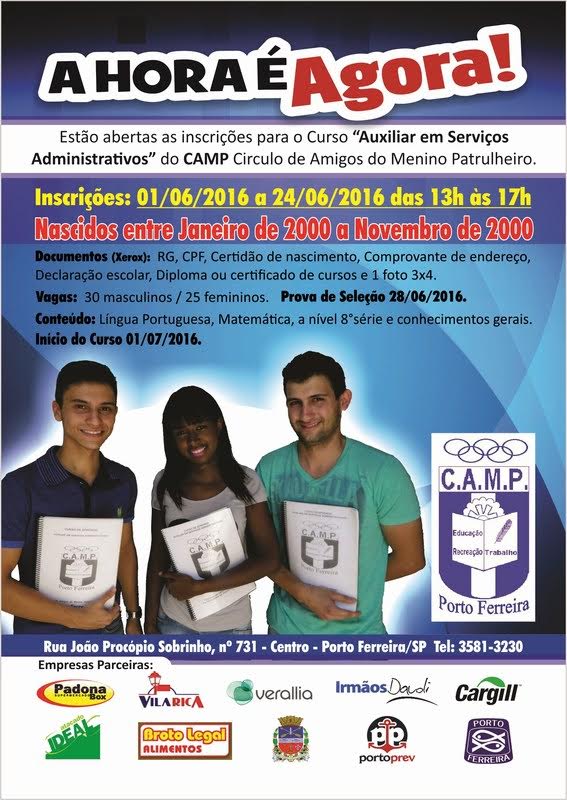 Até o dia 24 de junho estarão abertas as inscrições para o Curso "Auxiliar em Serviços Administrativos" do CAMP – Círculo de Amigos do Menino Patrulheiro de Porto Ferreira.
