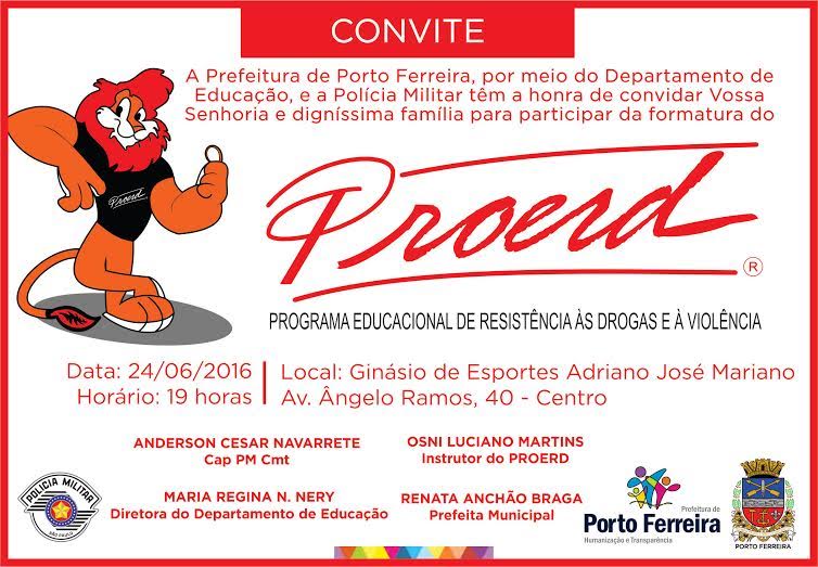 Nesta sexta-feira (24), às 19 horas, acontece no Ginásio de Esportes "Adriano José Mariano" a solenidade de formatura do Proerd (Programa Educacional de Resistência às Drogas), promovido na rede municipal de ensino em uma parceria da Prefeitura, por meio do Departamento de Educação, com a Polícia Militar do Estado de São Paulo.