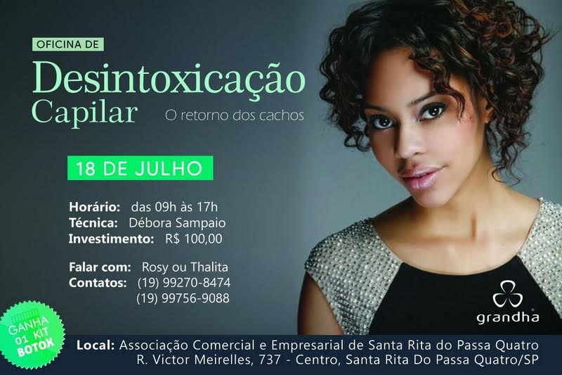 Dia 18 de Julho na Associação Comercial de Santa Rita do Passa Quatro promoverá um curso de Desintoxicação Capilar, "O retorno dos Cachos", com a técnica Debora Sampaio.