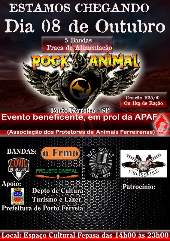 O evento será realizado do Espaço Cultural Fespasa dia 08 de outubro, sábado, das 14h00 às 23h00oo, em prol da da APAF (Associação dos Protetorres de Animais Ferreirense).