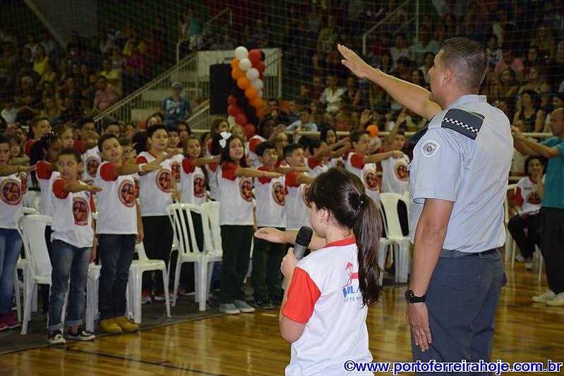 Trezentos e oitenta alunos dos quintos anos do ensino fundamental da EMEFM "Mário Borelli Thomaz", EMEF "Professor Agostinho Garcia", EMEF "Wladimir Salzano", EMEF "Professora Noraide Mariano", Centro Educacional do SESI (334). Colégio Objetivo, Colégio Cooperativo e Colégio "John Kennedy" receberam na noite de ontem (sexta-feira, 18) a certificação de conclusão do curso do PROERD de Porto Ferreira (Programa Educacional de Resistência às Drogas e à Violência da Polícia Militar do Estado de São Paulo). A solenidade aconteceu no Ginásio de Esportes "Adriano José Mariano".