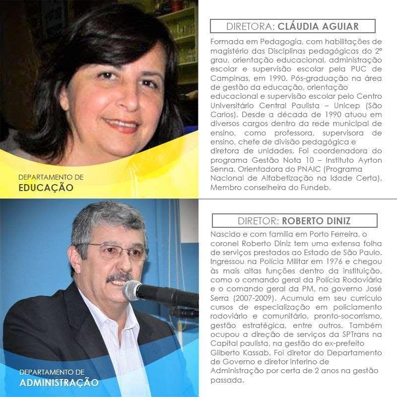 Diretor: Roberto Antônio Diniz. Nascido e com família em Porto Ferreira, o coronel Roberto Diniz tem uma extensa folha de serviços prestados ao Estado de São Paulo. Ingressou na Polícia Militar em 1976 e chegou às mais altas funções dentro da instituição, como o comando geral da Polícia Rodoviária e o comando geral da PM, no governo José Serra (2007-2009). Acumula em seu currículo cursos de especialização em policiamento rodoviário e comunitário, pronto-socorrismo, gestão estratégica, entre outros. Também ocupou a direção de serviços da SPTrans na Capital paulista, na gestão do ex-prefeito Gilberto Kassab. Foi diretor do Departamento de Governo e diretor interino de Administração por certa de 2 anos na gestão passada.
