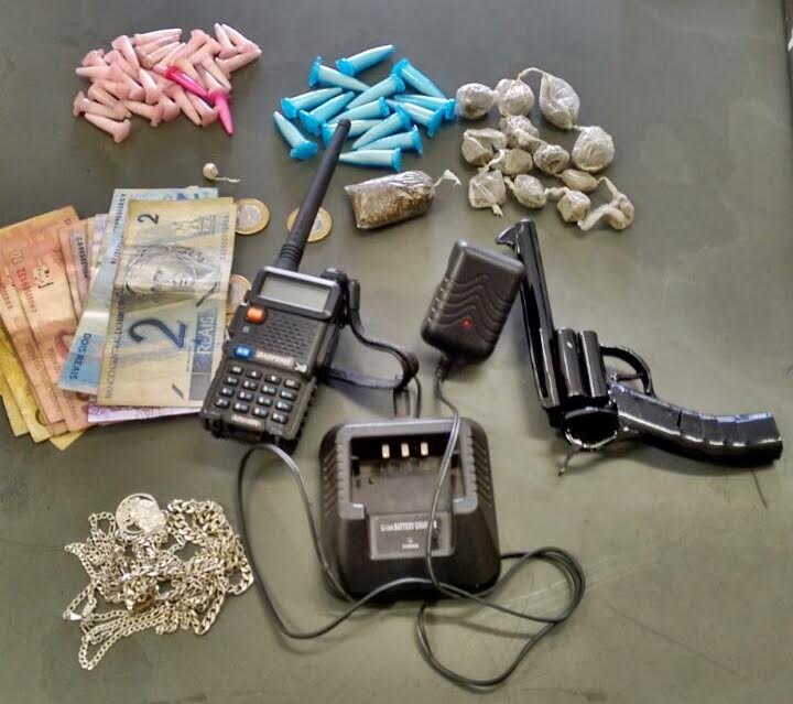Em buscas realizadas na casa do menor, no mesmo bairro, os policiais encontraram no interior de um guarda roupas um simulacro artesanal de revólver e um rádio comunicador na frequência da Polícia Militar. Também foiram localizados escondidos 43 pinos contendo cocaína, 14 trouxinhas de maconha e 02 pedras de crack, além de uma certa quantia em dinheiro em notas fracionadas.