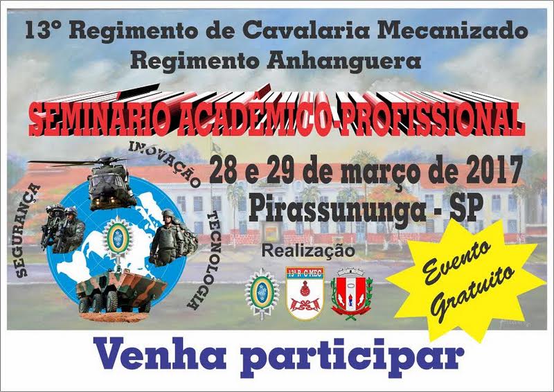 O 13º Regimento de Cavalaria Mecanizado, no contexto das ações da Rede de Estudos Estratégicos do Exército, realizará um seminário acadêmico-profissional versando sobre “Segurança Internacional: desafios à Força Expedicionária Brasileira” e “Gestão de Defesa: pesquisa e inovação gerando capacidades militares para o século XXI”. O evento é gratuito.