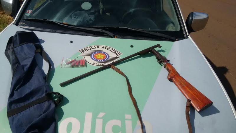 Durante vistoria no interior do veículo, foi localizado uma espingarda calibre 36 juntamente com 5 cartuchos sem nenhuma documentação.