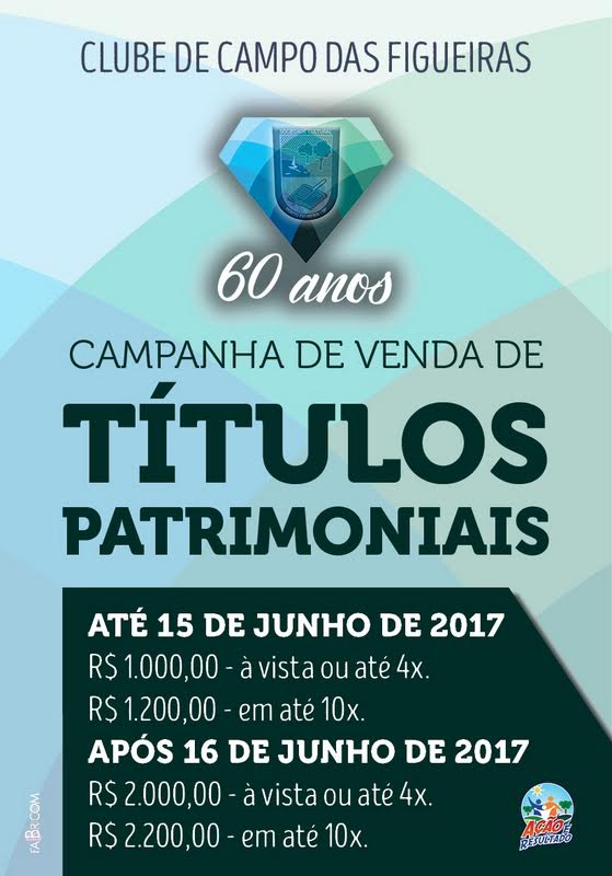 Termina na quinta-feira (15/06) a campanha de venda de títulos patrimoniais com descontos especiais do Clube de Campo das Figueiras. O interessado poderá adquirir o título por R$ 1 mil à vista ou até 4 vezes no cartão, ou ainda por R$ 1,2 mil em até dez vezes. A partir do dia 16 (sexta-feira) os valores sobem para R$ 2 mil e R$ 2,2 mil, respectivamente.