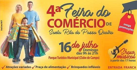 Sucesso na cidade e região a Feira do Comércio de Santa Rita do Passa Quatro chega a sua 4ª edição em 2017, no próximo dia 16 de julho, domingo. Considerada uma das principais ações do município em busca da geração de emprego e renda para a população, o evento acontece no Parque Turístico Municipal (Clube de Campo).
