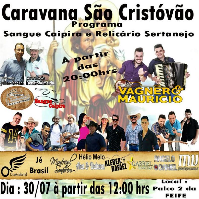 A “Caravana São Cristóvão”, dos programas Sangue Caipira e Relicário Sertanejo, terá os seguintes artistas: Du & Gabriel, Jé Brasil, Montreal & Santarém, Hélio Melo, Ana & Daiana, Kleber & Rafael, Gabriel Ferreira, Angelo & Daniel, Maurício Violla e, fechando a programação às 20 horas, Vagner & Maurício. A apresentação será de Juliano Modena e Renato Almeida.