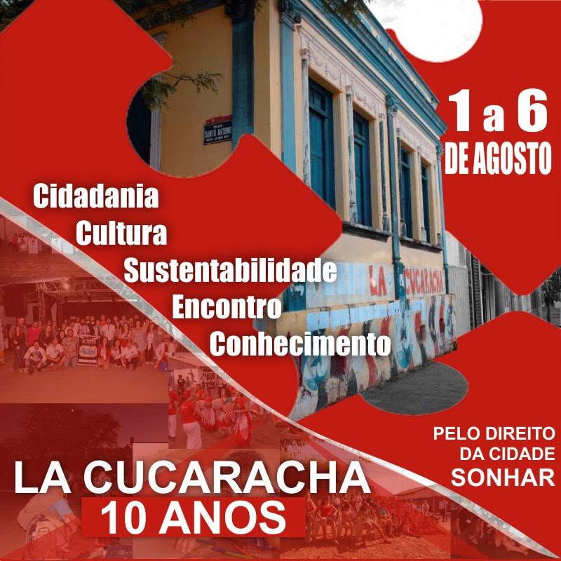 Com os objetivos de celebrar os seus dez anos, completados em 12 de julho, e dar um presente de aniversário para Tambaú-SP (que chega aos 119 anos de emancipação política em 20 de agosto), o Movimento La Cucaracha promoverá no município, entre 1 e 6 de agosto, o festival “La Cucaracha 10 anos – Pelo direito da cidade sonhar”.