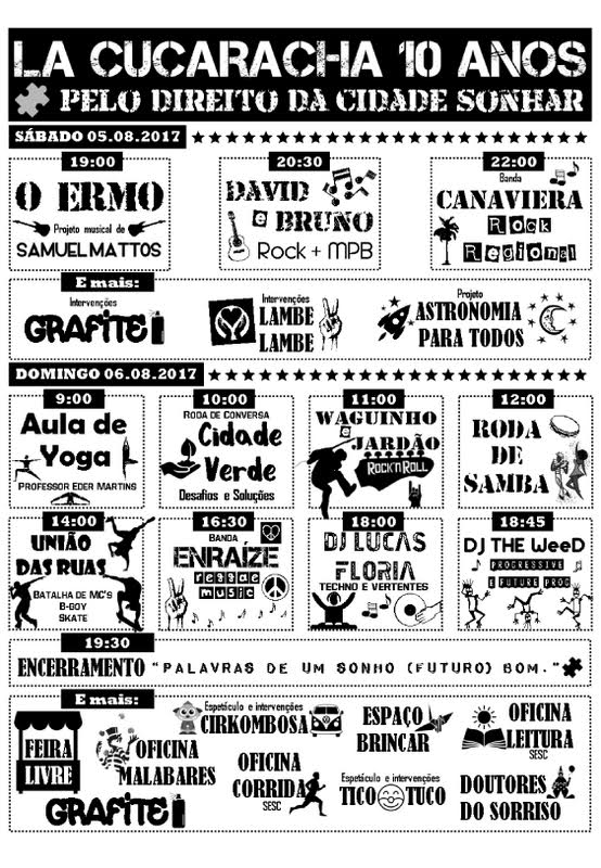 A celebração se estendeu de 1 e 6 de agosto, o festival “La Cucaracha 10 anos – Pelo direito da cidade sonhar”, ressalta a temática de um contraponto ao momento econômico e político que vivemos como nação, como coletivo e seres humanos. A mensagem do La Cucaracha é clara, a união em buscas de objetivos em comum, faz sumir rivalidades, traz a tona o brilho interior de cada um e resgata o direito de sonhar, que é o ponto de inicio para qualquer ação e mudança.