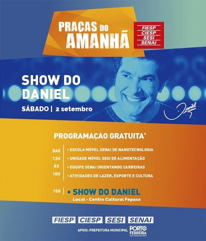 Porto Ferreira acordará para o futuro neste sábado (2), com o projeto Praças do Amanhã, que traz para Porto Ferreira diversas atividades de lazer, esporte e cultura, além de todo o romantismo do cantor Daniel em show gratuito. O projeto itinerante, que percorre todo o Estado de São Paulo desde maio deste ano, é uma oportunidade para que a população conheça de perto os programas do Sesi-SP e Senai-SP nas áreas de educação, lazer, cultura, esporte e ensino profissionalizante.