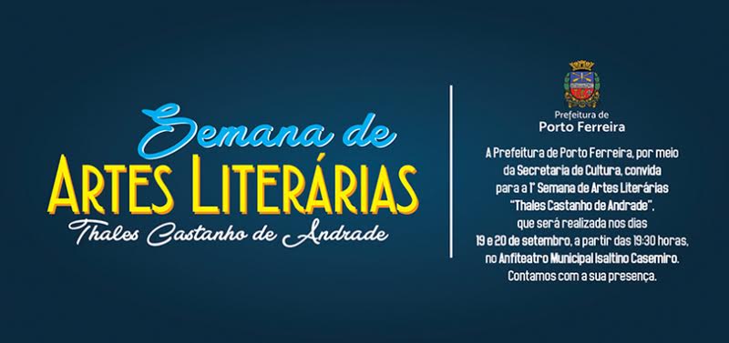 A Secretaria de Cultura de Porto Ferreira realiza nesta terça e quarta-feira, (19 e 20 de setembro), no Anfiteatro Isaltino Casemiro, a partir das 19 horas, a I Semana de Artes Literárias Thales Castanho de Andrade.