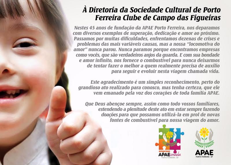 A Apae de Porto Ferreira enviou esta semana um agradecimento à Diretoria do Clube de Campo das Figueiras.