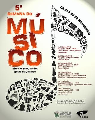 Definida a programação da 5º Semana do Músico de Santa Rita do Passa Quatro. Promovido pelo Departamento Municipal Cultura e Turismo, o evento acontece nos dias 21, 22, 23, 24 e 25 de novembro, terça-feira a sábado, nas praças da Bíblia, Poeta Mário Mattoso (Estação) e na Câmara Municipal.
