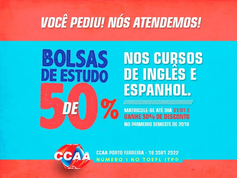 Aproveite os últimos dias para matricular nos cursos de Inglês e Espanhol no CCAA em Porto Ferreira e ganhar 50% de desconto no primeiro semestre de 2018!