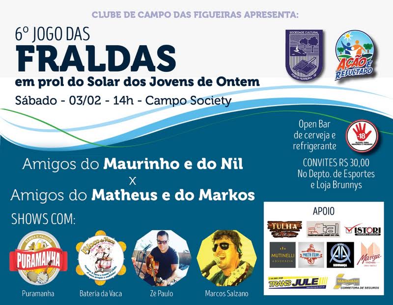 Sábado, dia 03 de Fevereiro de 2018, no Clube de Campo das Figueiras, 6º Jogo das Fraldas – Em Prol ao Solar " Os Jovens de Ontem" a partir das 14h00 no Campo Society.