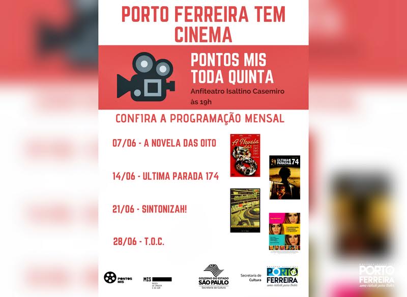 A Secretaria de Cultura de Porto Ferreira divulga a programação do projeto Ponto MIS de Cinema para o mês de junho.