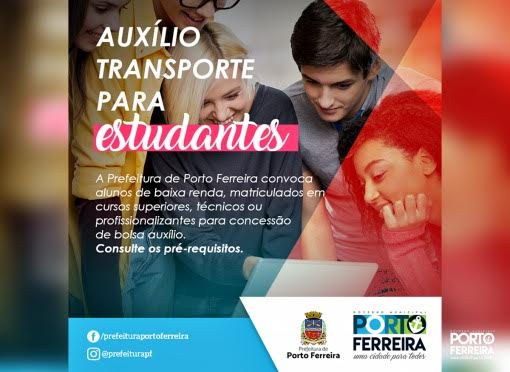 A Prefeitura de Porto Ferreira, por meio da Secretaria de Desenvolvimento Social e Cidadania, está convocando os estudantes matriculados e frequentando cursos de ensino superior, técnico e profissionalizante para inscrição de concessão de auxílio financeiro para o pagamento do transporte para o segundo semestre de 2018.