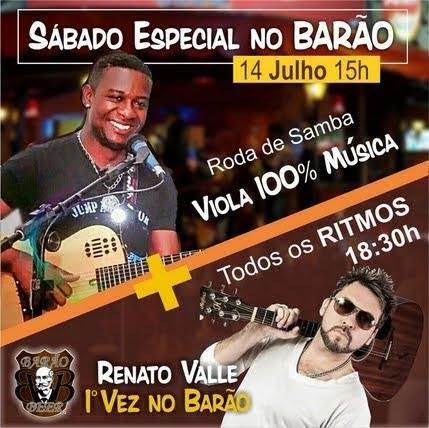 Sábado, dia 14 de Julho de 2018, roda de Samba a partir das 15h00 com Viola 100% Música e a partir das 18h30 todos os ritmos com Renato Valle (1ª vez no Barão Beer)