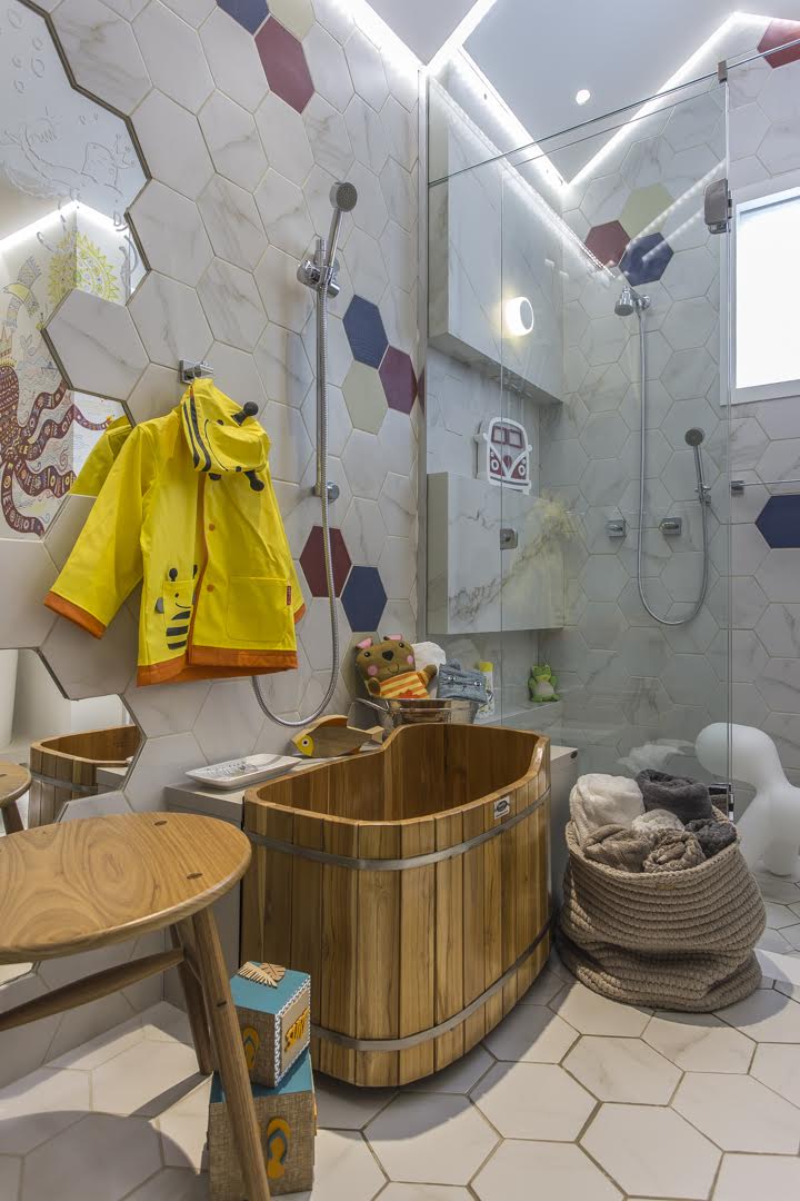 Junto ao Ôfuro há uma barra deslizante com ducha manual onde a criança pode operá-la subindo e descendo o jato de agua de forma prazerosa e funcional. Sobre o apoio de MDF que serpenteia o Ofurô livros de banho e objetos para higiene pessoal podem ser facilmente encontrados. Próximo disso tudo, há uma cadeira de designer para dar apoio aos pais ou cuidadores. O cesto de crochê cheio de toalhas convida à servir-se. O vaso sanitário faz parte da linha kids para atender a primeira infância sem que se precise de auxílio. Os papéis higiênicos ao encontro com mundo infantil, coloridos e em tons vibrantes, um produto que parece até uma obra de arte, e por isso ficando à mostra e ao alcance das mãozinhas.