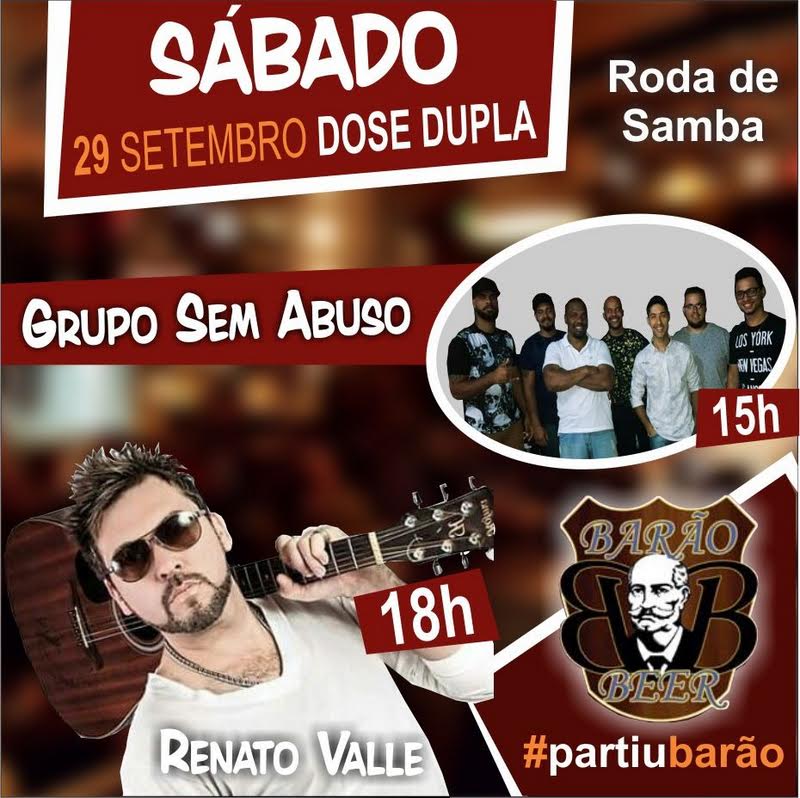 Sábado 29 de Setembro a partir das 15h00 Roda de Samba com o Grupo Sem Abuso e partir das 18h00 Renato Valle.