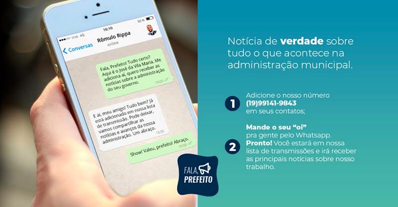 Para que você participar e receber os informativos do " Fala, Prefeito", basta adicionar o número (19) 99141-9843 na sua agenda, e mandar seu oi pelo Whatsapp. Pronto! Você já estará incluído na nossa lista de distribuição e irá receber as informações oficiais do município. Também poderá cancelá-la a qualquer momento.