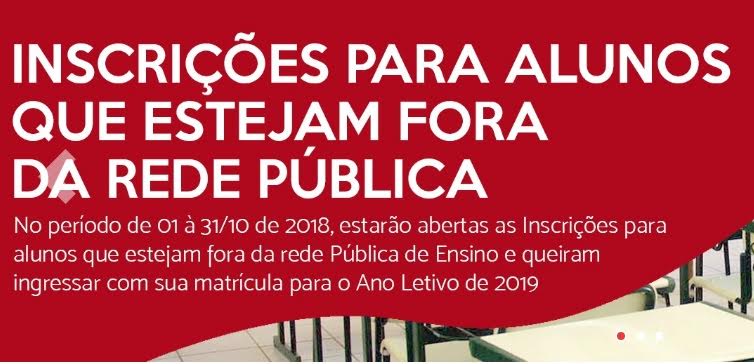 No período de 1 a 31 de outubro estarão abertas as inscrições para alunos que estejam fora da rede pública de ensino e queiram ingressar com sua matrícula para o ano letivo de 2019: