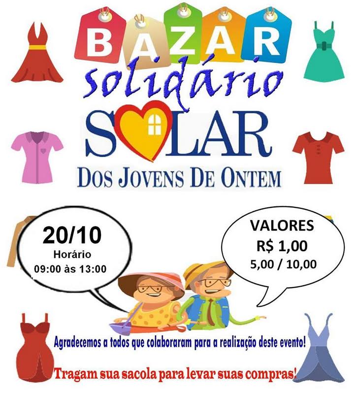 O Solar dos Jovens de Ontem de Porto Ferreira promove hoje – sábado(20/10) mais um Bazar Solidário na sede do Solar, localizada à rua João Colussi nº 307, Estância dos Granjeiros, em Porto Ferreira – SP, telefone (19) 3581- 2586